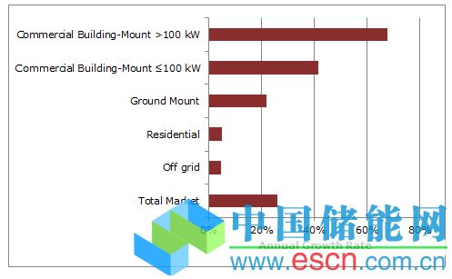 裝機規(guī)模在100KW以下的小型商業(yè)應用預計將同比增長約40%,而大型商業(yè)項目的年增長率將達到70%,與地面光伏系統相比,增長率分別達到兩倍和三倍。