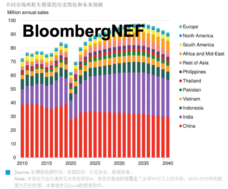 2040年全球電動兩輪車新車銷量的占比
