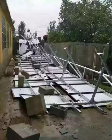 以抗傾覆設(shè)計舉例,屋面光伏項目需要設(shè)計的抗傾覆系數(shù)是1.6,也就是說要設(shè)計的抗傾覆彎矩是傾覆彎矩的1.6倍,才能滿足安全要求。因此,圖3電站中的抗傾覆彎矩大概需要設(shè)計到952千牛米,才是安全的。而屋面電站的結(jié)構(gòu)事故許多也是因為抗傾覆設(shè)計不足造成的,如下圖: