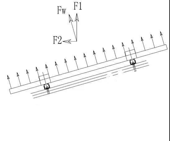 經(jīng)過計算,垂直于光伏組件表面的上吸風(fēng)力標(biāo)準(zhǔn)值約Fw=71.008kN。根據(jù)角度關(guān)系計算,在逆風(fēng)時產(chǎn)生的豎向吸力F1= cos(20°)xFw=66.726 kN≈6.7噸;逆風(fēng)時最大Fw引起的傾覆彎矩Gw=Fwx16.75/2=595.295 kN·m;由于基礎(chǔ)形式不能確定,所以無法試算抗滑移相關(guān)數(shù)據(jù)。