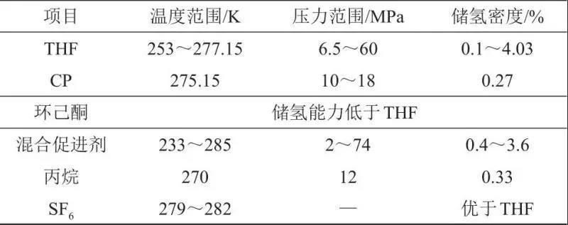 但純氫生成水合物的條件較苛刻,且為了提高氫氣質(zhì)量密度,對溫度、壓力要求更高,能耗增加、安全性降低。因此,學者們提出向氫氣中加入能生成Ⅱ型水合物的促進劑(THF、環(huán)己酮、CP等)或氣體,讓這些物質(zhì)進入水合物孔穴、起到在較緩和條件下穩(wěn)定水合物的目的,進而降低水合物生成條件。但如表5所示,由于其它分子占據(jù)了水合物孔穴,減少了氫氣可占據(jù)的孔穴,導致氫氣的質(zhì)量密度下降。