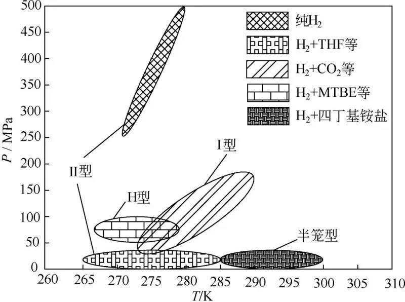 由圖3可知, H2分子較小,溫度大于270 K時,純氫須在壓力大于250 MPa下,才能生成水合物(Ⅱ型)。但是當有四氫呋喃(tetrahydrofuran, THF)、環(huán)己酮、環(huán)戊烷(cyclopentane,CP)等促進劑存在時,H2在溫度為265~285 K,壓力小于30 MPa條件下,即可生成水合物(Ⅱ型);當有甲基叔丁基醚(methyl tert-butyl ether,MTBE)、甲基環(huán)己烷(methylcyclohexane,MCH)等大分子物質(zhì)存在時,H2在溫度為267~279 K,壓力為50~100 MPa條件下,即可生成水合物(H型);當有四丁基溴化銨(tetrabuyl ammonium bromide,TBAB)、四丁基氯化銨(tetrabutyl ammonium chloride,TBAC)、四丁基氟化銨(tetrabutyl ammonium fluoride,TBAF)等四丁基銨鹽離子液體存在時,H2在溫度為285~