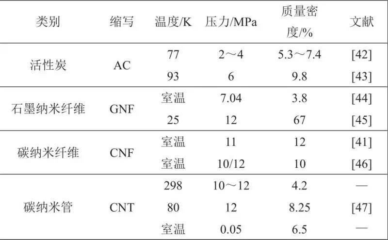 一些碳質(zhì)材料,如表面活性炭、石墨納米纖維、碳納米管等,在一定條件下對氫的吸附能力較強,因此,人們提出利用其進行儲氫。各類碳質(zhì)材料的儲氫性能如表4所示。