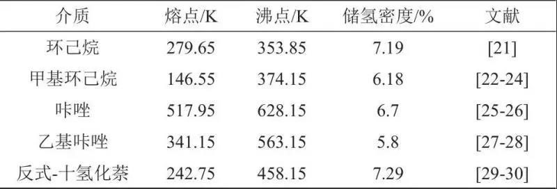 有機液體儲氫技術(shù)基于不飽和液體有機物在催化劑作用下進行加氫反應(yīng),生成穩(wěn)定化合物,當需要氫氣時再進行脫氫反應(yīng)。常用的不飽和液體有機物及其性能如表2所示。