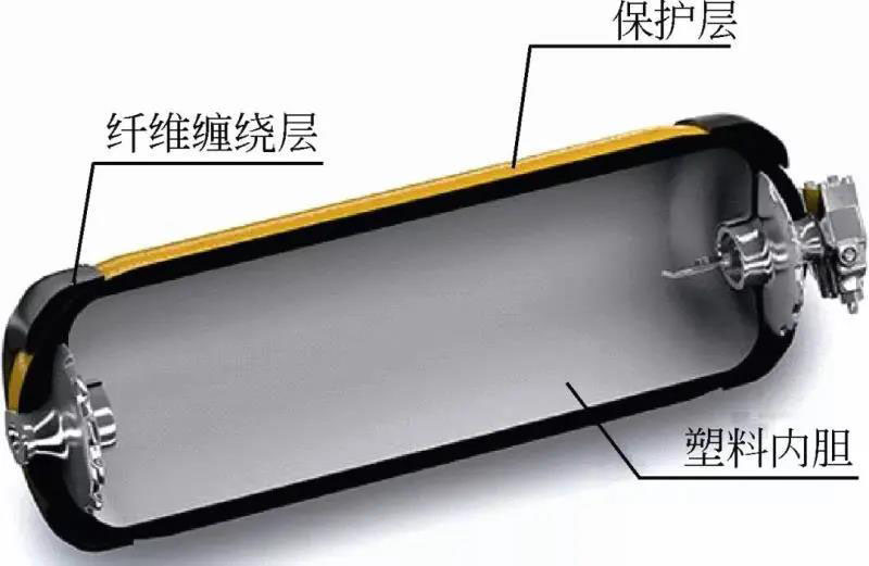為了進一步降低儲罐質(zhì)量,人們利用具有一定剛度的塑料代替金屬,制成了全復(fù)合輕質(zhì)纖維纏繞儲罐。如圖2所示,這類儲罐的筒體一般包括3層:塑料內(nèi)膽、纖維增強層、保護層。塑料內(nèi)膽不僅能保持儲罐的形態(tài),還能兼作纖維纏繞的模具。同時,塑料內(nèi)膽的沖擊韌性優(yōu)于金屬內(nèi)膽,且具有優(yōu)良的氣密性、耐腐蝕性、耐高溫和高強度、高韌性等特點。