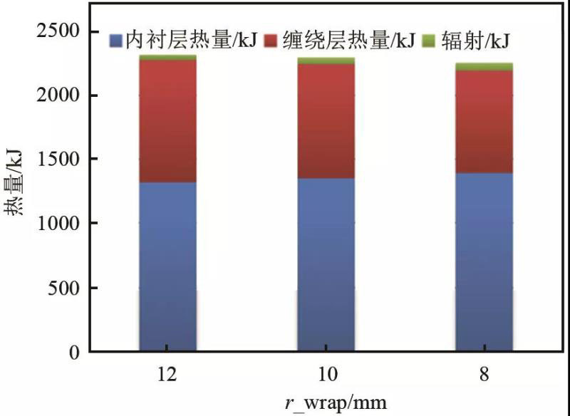 儲(chǔ)氫瓶的纏繞層一般由碳纖維和環(huán)氧樹(shù)脂復(fù)合材料構(gòu)成,對(duì)于不同制造商生產(chǎn)的III型瓶,其纏繞層的厚度可能不同,有必要研究其對(duì)加氫溫升的影響。圖5是不同纏繞層厚度下,加氫過(guò)程中儲(chǔ)氫瓶?jī)?nèi)氫氣的散熱量對(duì)比,加氫條件與2.1節(jié)所描述一致。結(jié)果表明,當(dāng)纏繞層厚度由12 mm減薄至8 mm時(shí),加氫過(guò)程中瓶?jī)?nèi)氫氣總散熱量由2317 kJ降低為2255 kJ,加氫結(jié)束后瓶?jī)?nèi)氫氣溫度由73.5 ℃上升至75.2 ℃。當(dāng)儲(chǔ)氫瓶的纏繞層厚度減小時(shí),加氫過(guò)程中氫氣的散熱量有所降低,但降低幅度不如內(nèi)襯層厚度減薄時(shí)明顯。這是由于纏繞層材料導(dǎo)熱系數(shù)顯著低于內(nèi)襯層,其貢獻(xiàn)的氫氣散熱量低于內(nèi)襯層;另一方面,當(dāng)纏繞層厚度減薄后,纏繞層材料質(zhì)量減少、吸收總熱量減少,因此貢獻(xiàn)的氫氣散熱量降低。此外,儲(chǔ)氫瓶壁面至環(huán)境的自然對(duì)流散熱量十分有限,纏繞層厚度減薄導(dǎo)致的外壁面對(duì)流散熱量增加可忽略不計(jì)。