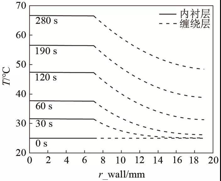 為進(jìn)一步考察內(nèi)襯層和纏繞層在加氫過(guò)程中的換熱行為,對(duì)儲(chǔ)氫瓶壁面的徑向溫度分布隨時(shí)間的變化進(jìn)行研究,結(jié)果如圖3所示。加注起始時(shí)刻(t=0 s時(shí)刻),儲(chǔ)氫瓶壁面沿徑向溫度一致,加注30s后,內(nèi)襯層溫度升高,在7 mm徑向厚度內(nèi)基本無(wú)溫度梯度。相比之下,纏繞層在徑向出現(xiàn)明顯的溫度梯度,其內(nèi)壁和外壁溫差已經(jīng)達(dá)到約6 ℃。隨著加氫時(shí)間的進(jìn)行,瓶?jī)?nèi)氫氣與壁面發(fā)生換熱,導(dǎo)致內(nèi)襯層溫度逐漸升高,與此同時(shí),其徑向仍然無(wú)明顯的溫度梯度,說(shuō)明內(nèi)襯層材料導(dǎo)熱快;纏繞層沿徑向表現(xiàn)出更加顯著的溫度梯度,當(dāng)加注結(jié)束時(shí),纏繞層的內(nèi)外壁溫差已提高至8 ℃,這是纏繞層材料導(dǎo)熱較慢所致。另一方面,加注結(jié)束時(shí),儲(chǔ)氫瓶外壁溫度為48 ℃,與室溫形成了23 ℃溫差,這是由于瓶壁向環(huán)境散熱受到自然對(duì)流過(guò)程控制,加注時(shí)間內(nèi)散熱量很小。因此,加氫過(guò)程中,儲(chǔ)氫瓶?jī)?nèi)氫氣對(duì)外散熱經(jīng)內(nèi)襯層的導(dǎo)熱速度快,在纏繞層導(dǎo)熱慢、形成顯著的溫度梯度,瓶外壁與環(huán)境的換熱量很小,儲(chǔ)氫瓶壁面各層材料的厚度和導(dǎo)熱特性對(duì)加氫溫升有重要影響。