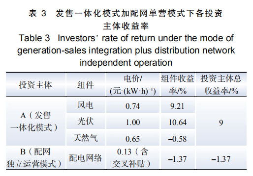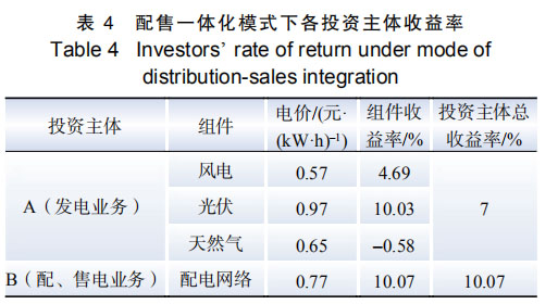 運(yùn)營(yíng)模式 3:配售一體化模式。園區(qū)微網(wǎng)由 A 和 B 投資。A 投資風(fēng)電、光伏、天然氣,從事發(fā)電業(yè)務(wù),采用全部上網(wǎng)模式;B 投資園區(qū)配網(wǎng), 從事配網(wǎng)、售電業(yè)務(wù)。投資收益結(jié)果如表 4 所示。