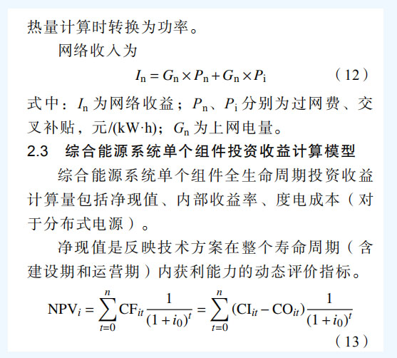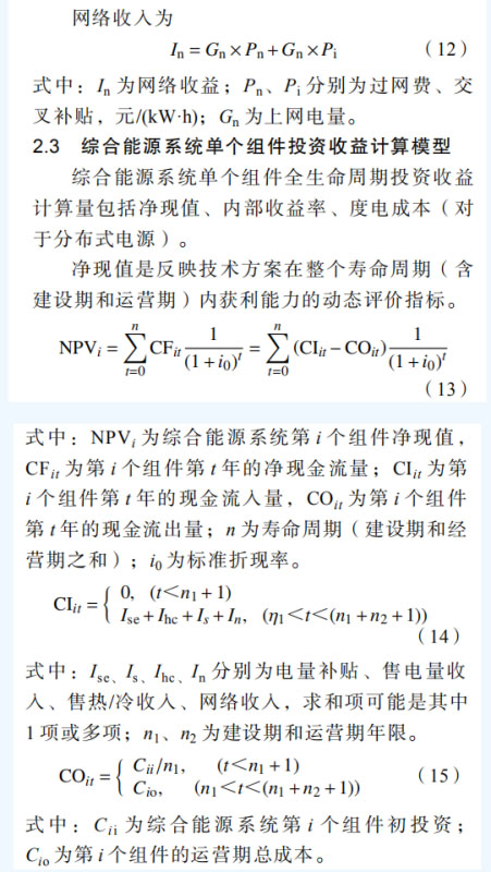 綜合能源系統(tǒng)是在規(guī)劃、建設(shè)和運(yùn)行等過(guò)程中,對(duì)各種能源的產(chǎn)生、傳輸與分配(供能網(wǎng) 絡(luò))、轉(zhuǎn)換、存儲(chǔ)、消費(fèi)、交易等環(huán)節(jié)實(shí)施有機(jī) 協(xié)調(diào)與優(yōu)化,進(jìn)而形成的能源產(chǎn)供消一體化系 統(tǒng)[1-2]。目前中國(guó)正處于能源轉(zhuǎn)型關(guān)鍵時(shí)期,能源成本高等問(wèn)題突出。綜合能源系統(tǒng)可有效提高能 效、降低投資運(yùn)營(yíng)成本,帶動(dòng)和提升能源相關(guān)產(chǎn)業(yè)的國(guó)際競(jìng)爭(zhēng)力,對(duì)推進(jìn)能源供給側(cè)改革、推動(dòng)中國(guó)能源轉(zhuǎn)型具有重要意義,是“建設(shè)清潔低碳、安全高效的現(xiàn)代能源體系”的重要組成部分[3]。 世界各國(guó)均制定了綜合能源系統(tǒng)建設(shè)發(fā)展戰(zhàn) 略,美國(guó)能源部 DOE2001 年提出綜合能源系統(tǒng)發(fā) 展計(jì)劃,并于 2007 年 12 月頒布能源獨(dú)立和安全 法(EISA),要求在社會(huì)主要供用能環(huán)節(jié)必須規(guī) 劃綜合能源,美國(guó)一些大型電力公司同時(shí)也是典 型的綜合能源供應(yīng)商,如太平洋煤氣電力公司、 愛(ài)迪生電力公司等 [ 4 ]。加拿大內(nèi)閣能源委員會(huì) 2009 年 9 月頒布了相關(guān)指導(dǎo)意見(jiàn)[5],明確提出在 全國(guó)范圍構(gòu)建社區(qū)綜合能源系統(tǒng)( integrated communityenergysolutions,ICES)。歐盟第 5 代框 架中提出多能源協(xié)同優(yōu)化,對(duì)用戶(hù)側(cè)綜合能源系統(tǒng)、多能源協(xié)同優(yōu)化互補(bǔ)、可再生能源開(kāi)發(fā)與交通運(yùn)輸清潔化等展開(kāi)研究[6],之后的第 6 代、第 7 代框架中繼續(xù)對(duì)多能源系統(tǒng)優(yōu)化展開(kāi)了深入研 究[7-8],于 2014 年提出地平線 2020 計(jì)劃,在智 能、綠色和綜合交通領(lǐng)域投入 63.39 億歐元,在安全、清潔和高效能源領(lǐng)域投入 59.31 億歐元。 日本重點(diǎn)開(kāi)展智能社區(qū)技術(shù)的研究與示范,基于 社區(qū)綜合能源系統(tǒng)(包括:電力、燃?xì)狻崃Α?可再生能源等),集成交通、供水、信息和醫(yī)療系統(tǒng)[9]。中國(guó) 2016 年召開(kāi)雙清論壇“新一代電力綜 合能源系統(tǒng)”,在多個(gè) 973、863 項(xiàng)目啟動(dòng)了綜合 能源系統(tǒng)研究,且與新加坡、德國(guó)、英國(guó)等國(guó)家 在綜合能源系統(tǒng)基礎(chǔ)理論、關(guān)鍵技術(shù)、核心設(shè)備 和工程示范等多個(gè)方面開(kāi)展國(guó)際合作?;诰C合 能源系統(tǒng)的綜合能源服務(wù)已成為眾多發(fā)電企業(yè)、 新能源企業(yè)、電網(wǎng)企業(yè)重要轉(zhuǎn)型方向[10-11]。 隨著電力市場(chǎng)化改革推進(jìn),園區(qū)成為電力改 革重要實(shí)驗(yàn)區(qū),園區(qū)綜合能源系統(tǒng)建設(shè)運(yùn)營(yíng)成為 綜合能源服務(wù)商主攻業(yè)務(wù)[1 2-1 3]。在增量配電放 開(kāi)、多元源荷廣泛接入下,園區(qū)綜合能源系統(tǒng)投 資界面出現(xiàn)了分化,投資主體也呈現(xiàn)多元化特點(diǎn),投資效益分析變得錯(cuò)綜復(fù)雜。目前綜合能源系統(tǒng)經(jīng)濟(jì)性研究方面已有一些針對(duì)單個(gè)組成單 元,比如分布式光伏開(kāi)展了量化測(cè)算[14-16],對(duì)分布式天然氣、配網(wǎng)等開(kāi)展了經(jīng)濟(jì)指標(biāo)評(píng)價(jià)法,但量化投資效益測(cè)算尚未開(kāi)展[17-19],此外,分界面 屬于電改形勢(shì)下產(chǎn)生的新問(wèn)題,面向多主體的綜合能源系統(tǒng)分界面投資效益量化分析目前尚未有相關(guān)研究成果可供參考和借鑒。