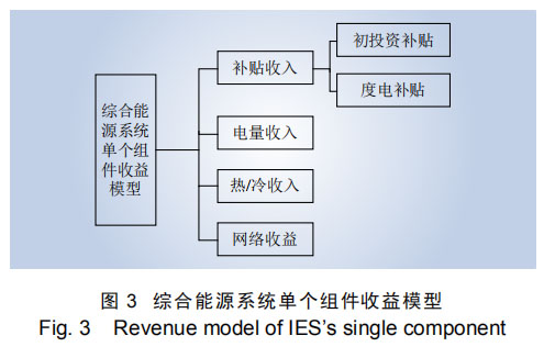 單個(gè)組件收益模型綜合能源系統(tǒng)單個(gè)組件收益包括初投資補(bǔ)貼、熱/冷收入(天然氣)、電量收入、度電補(bǔ)貼等,單個(gè)組件收益模型如圖 3 所示。