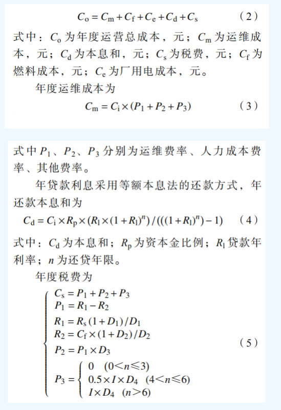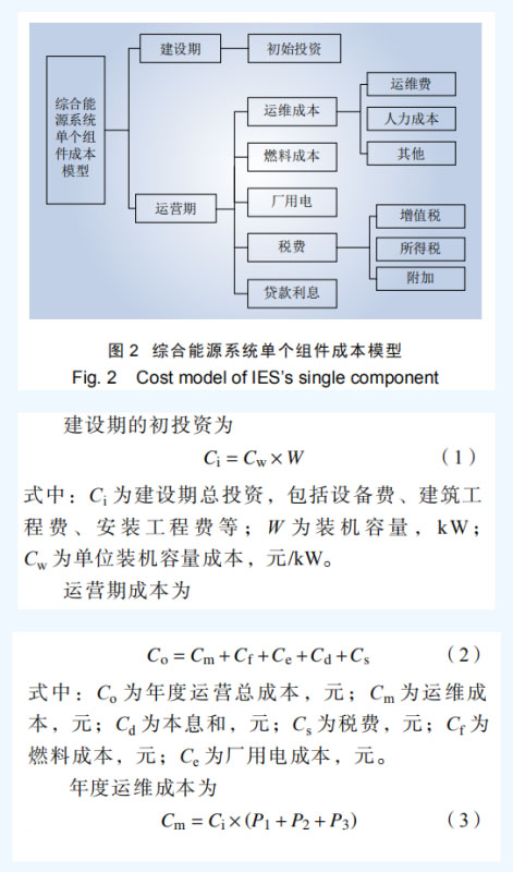 2.1 綜合能源系統(tǒng)單個(gè)組件成本模型 綜合能源系統(tǒng)單個(gè)組件成本包括建設(shè)期的初始投資,運(yùn)營(yíng)期的運(yùn)維成本(運(yùn)維費(fèi)、人力成本 等)、燃料成本(對(duì)于分布式天然氣、生物質(zhì)有 此成本,光伏、風(fēng)電沒(méi)有)、廠用電損耗、貸款 利息、稅費(fèi)等,單個(gè)組件成本模型如圖 2 所示。