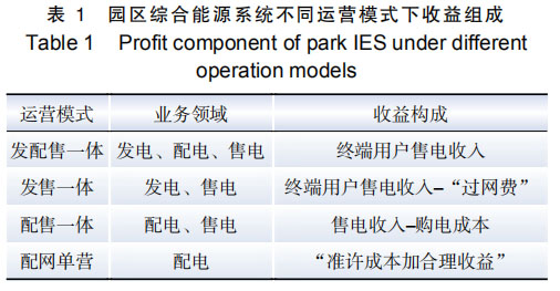 不同運(yùn)營(yíng)模式下投資主體能整合資源不同, 所經(jīng)營(yíng)業(yè)務(wù)領(lǐng)域也不同,所以收益組成也不相同。比如對(duì)于配網(wǎng)單營(yíng)模式,擁有的是配網(wǎng)資源,從事的是配電業(yè)務(wù),通過(guò)“準(zhǔn)許成本加合理收益”獲取收益;對(duì)于發(fā)售一體化模式,擁有的是分布式發(fā)電資源和用戶(hù)負(fù)荷資源,收益為用戶(hù)售電收入與“過(guò)網(wǎng)費(fèi)”之差。對(duì)于同時(shí)涉及多種業(yè)務(wù),收益是多種業(yè)務(wù)收益的疊加。表 1 展示了 園區(qū)綜合能源系統(tǒng)不同運(yùn)營(yíng)模式下收益構(gòu)成。