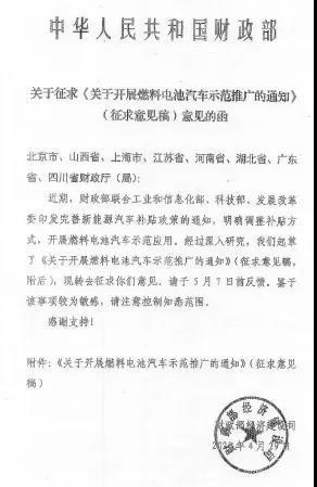 財(cái)政部經(jīng)濟(jì)建設(shè)司于4月29日向8家省級(jí)財(cái)政部門印發(fā)了《關(guān)于征求<關(guān)于開展燃料電池汽車示范推廣的通知>(征求意見(jiàn)稿)意見(jiàn)的函》。