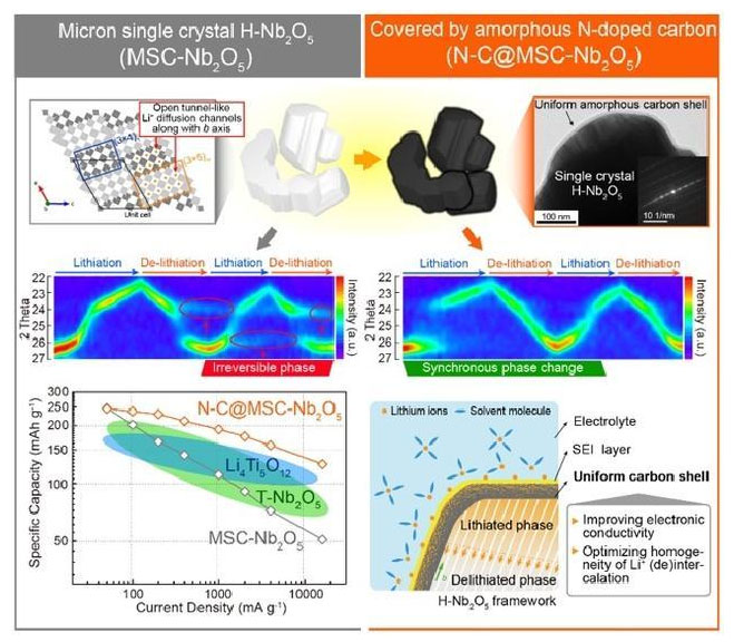 引入無定型碳層對H型Nb2O5晶體表界面電子和離子輸運均勻性及結(jié)構(gòu)變化可逆性的改善策略示意圖