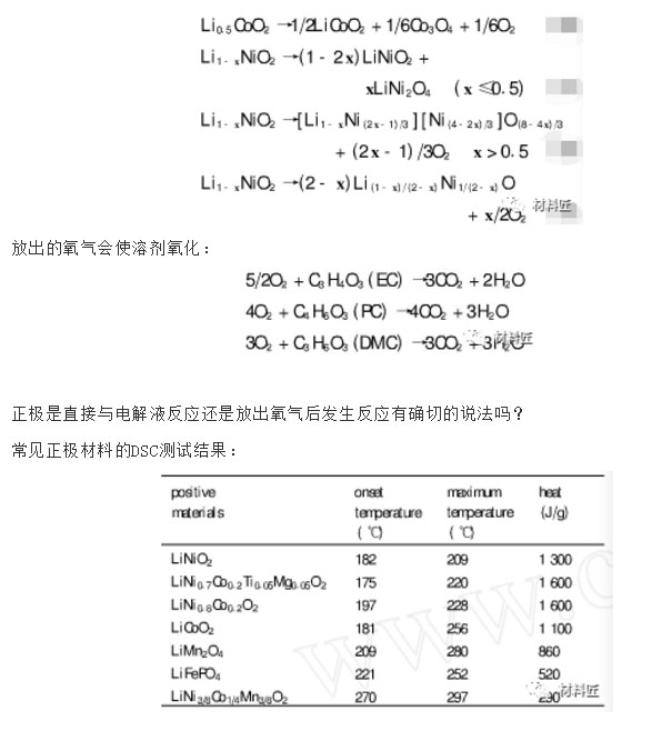 常見的正極材料在溫度低于650℃時是穩(wěn)定的,在充電時處于亞穩(wěn)定狀態(tài),溫度升高時發(fā)生如下反應。