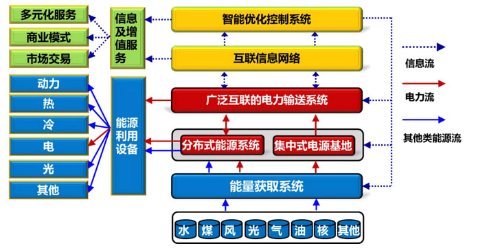 以智能電網為核心、具有廣泛互聯和智能化特征的能源輸送網絡將構成骨干網架,實現以電為中心的大范圍余缺互濟、經濟高效配置和系統級安全保障;以多種能源分散、梯級利用為特征的分布式能源系統將構成末端節(jié)點,實現能源的集約高效利用。