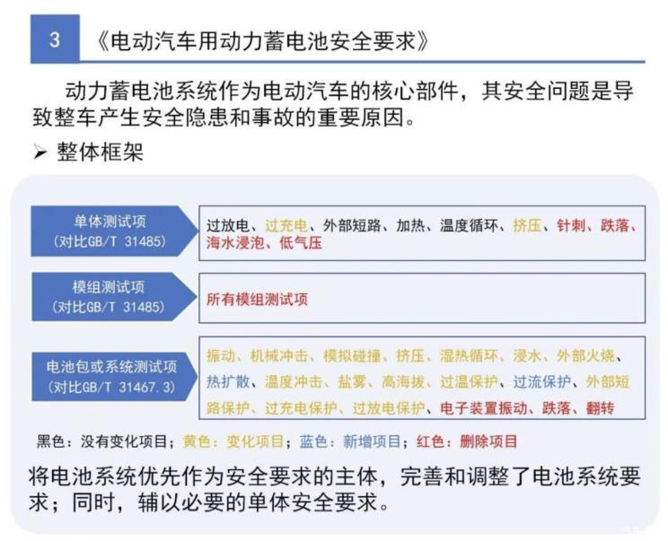 《電動(dòng)汽車用動(dòng)力蓄電池安全要求》在優(yōu)化電池單體、模組安全要求的同時(shí),重點(diǎn)強(qiáng)化了電池系統(tǒng)熱安全、機(jī)械安全、電氣安全以及功能安全要求,試驗(yàn)項(xiàng)目涵蓋系統(tǒng)熱擴(kuò)散、外部火燒、機(jī)械沖擊、模擬碰撞、濕熱循環(huán)、振動(dòng)泡水、外部短路、過(guò)溫過(guò)充等。特別是標(biāo)準(zhǔn)增加了電池系統(tǒng)熱擴(kuò)散試驗(yàn),要求電池單體發(fā)生熱失控后,電池系統(tǒng)在5分鐘內(nèi)不起火不爆炸,為乘員預(yù)留安全逃生時(shí)間。