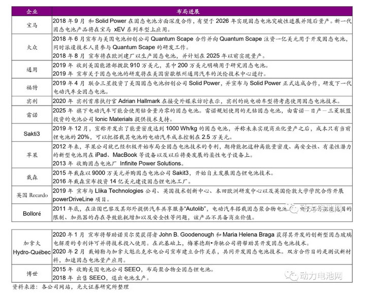 歐洲謀求固態(tài)電池領(lǐng)域翻盤,歐美各大車企投資固態(tài)電池初創(chuàng)企業(yè)。2019 年初,歐洲最大的應用科學研究機構(gòu)德國弗勞恩霍夫硅酸鹽研究所和瑞士聯(lián)邦材料測試和研究實驗室合作固態(tài)電池戰(zhàn)略性項目“IE48”。 車企通過收購、投資在固態(tài)電池領(lǐng)域中美國高校衍生的初創(chuàng)企業(yè)如 Solid Power、Solid Energy Systems、Ionic Materials 、Quantum Scape 等以獲得技術(shù)儲備。 考慮到投資風險過大,博世 2018 年出售 SEEO,取消電池生產(chǎn)并剝離相應資產(chǎn)。