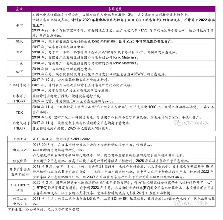 日韓企業(yè)抱團研發(fā),豐田計劃 2022 年實現(xiàn)搭載固態(tài)電池的電動汽車量產(chǎn)。 由于意識到固態(tài)電池潛力巨大,日本很早就開始進行研發(fā),目前全球范圍內(nèi)日本企業(yè)的固態(tài)電池技術(shù)較為領(lǐng)先。韓國技術(shù)領(lǐng)先的三大電池企業(yè)也選擇聯(lián)合研發(fā)固態(tài)電池??梢钥闯觯枕n無論是電池企業(yè)還是車企,在保有獨立研發(fā)團隊的基礎上,在固態(tài)電池的研發(fā)方面大多采用“抱團取暖”方式。