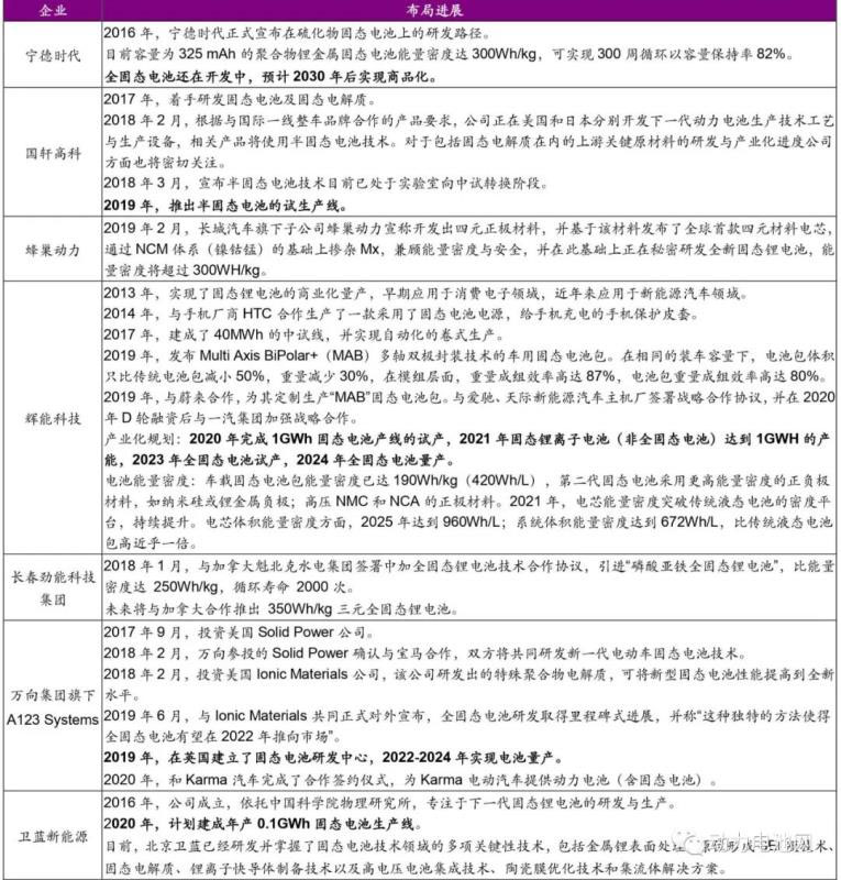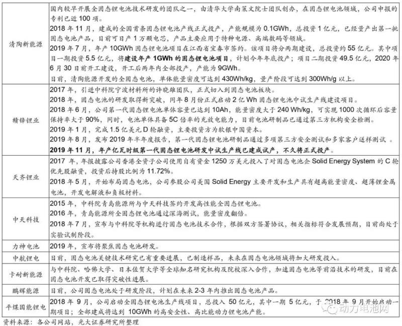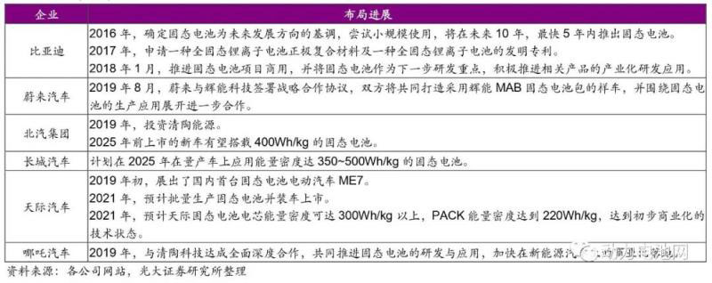 中國提前布局,部分企業(yè)已進入固態(tài)鋰離子電池(半固態(tài)電池)中試階段, 2025 年前可能實現(xiàn)固態(tài)電池量產(chǎn)。中國早在十年前已著手布局固態(tài)電池產(chǎn)業(yè),多家電池廠商固態(tài)電池技術(shù)領(lǐng)先,越來越多的企業(yè)參與固態(tài)電池研究。