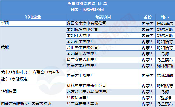 以上主要為風(fēng)電、光伏等新能源發(fā)電側(cè)配置儲(chǔ)能項(xiàng)目動(dòng)態(tài),除此之外,據(jù)北極星儲(chǔ)能網(wǎng)統(tǒng)計(jì),內(nèi)蒙古地區(qū)還有蒙能集團(tuán)、華潤(rùn)集團(tuán)華能集團(tuán)等開(kāi)展了13個(gè)火電儲(chǔ)能聯(lián)合調(diào)頻項(xiàng)目。