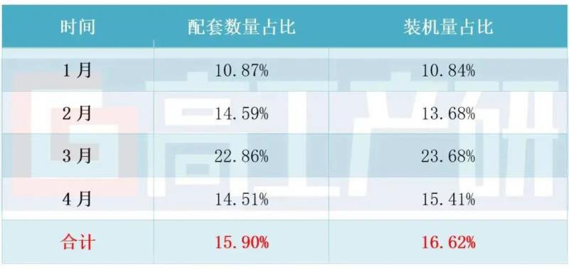 2020年1-4月比亞迪配套數量及裝機量占比分析