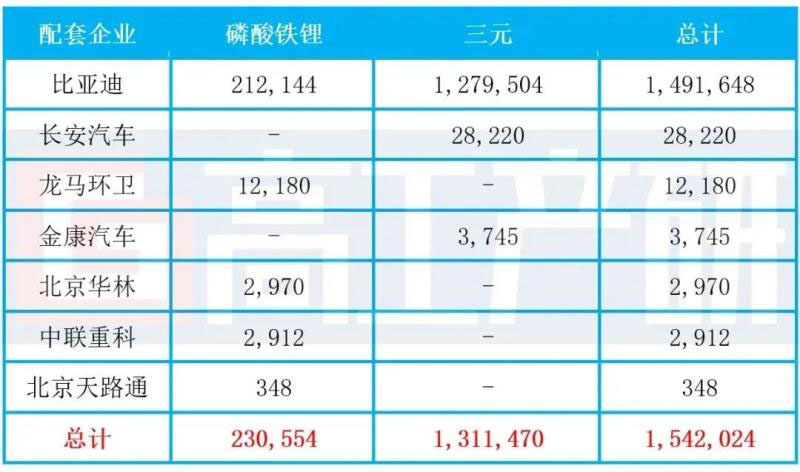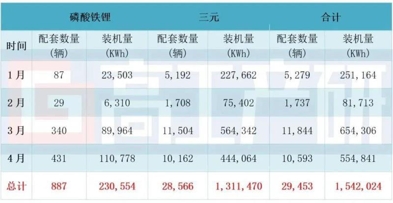 其中,三元動力電池合計配套新能源汽車28,566輛,同比下降70%,裝機量合計約1.31GWh,同比下降68%;磷酸鐵鋰動力電池合計配套新能源汽車887輛,同比下降70%,裝機量合計約0.23GWh,同比下降68%。