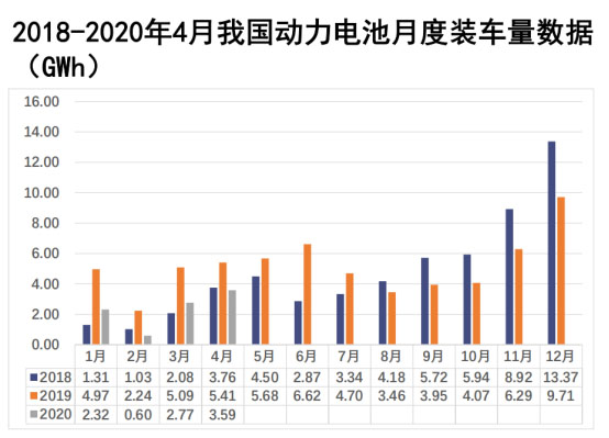 2020年1-4月,我國動力電池產(chǎn)量累計13.0GWh