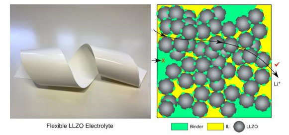 因此,東京都立大學(xué)的一個研究小組在Kiyoshi Kanamura教授的領(lǐng)導(dǎo)下,開始研發(fā)一種能夠在室溫下制作的柔性復(fù)合LLZO片狀電解質(zhì)。研究人員在薄薄的聚合物基材上澆上LLZO陶瓷泥漿,就像在吐司上涂上黃油一樣。然后,再放到真空爐中進(jìn)行干燥,之后,該款75微米厚的片狀電解質(zhì)會被浸泡到離子液體(IL)中,以提升其離子電導(dǎo)率。離子液體就是室溫下的液體鹽,眾所周知,其導(dǎo)電率高,而且?guī)缀醪灰兹?,也不揮發(fā)。在該片狀電解質(zhì)內(nèi)部,離子液體成功填補(bǔ)了結(jié)構(gòu)中的微小缺口,橋接了LLZO顆粒,為鋰離子形成一個有效通道;此外,還有效降低了陰極接觸界面的電阻。在進(jìn)一步研究中,研究人員發(fā)現(xiàn),結(jié)構(gòu)中的鋰離子既在離子液體,也在LLZO顆粒中擴(kuò)散,因而離子液體和LLZO顆粒都突出發(fā)揮了作用。該合成法非常簡單,適合工業(yè)化生產(chǎn),而且整個過程都在室溫下進(jìn)行,無需高溫?zé)Y(jié)。