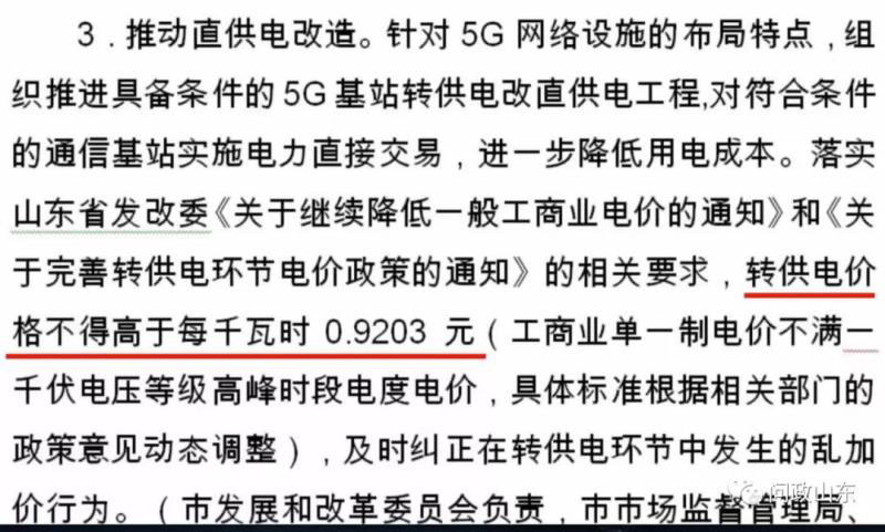 5G基站用電類型屬于非高耗能行業(yè)電用戶,今年2月山東省發(fā)改委《關(guān)于階段性降低工商業(yè)用電價(jià)格支持企業(yè)復(fù)工復(fù)產(chǎn)的通知》中指出:此類用戶計(jì)收電費(fèi)時(shí),轉(zhuǎn)供電單位收費(fèi)標(biāo)準(zhǔn)不得高于每千瓦時(shí)0.8743元。今年3月份煙臺(tái)發(fā)布關(guān)于加快5G產(chǎn)業(yè)發(fā)展的實(shí)施意見(jiàn)征求意見(jiàn)函,其中也明確:轉(zhuǎn)供電價(jià)格不得高于每千瓦時(shí)0.9203元。