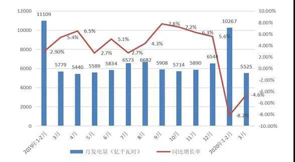 受疫情和暖冬疊加影響,用電需求受到抑制。2020年一季度,全國全社會用電量1.57萬億千瓦時,同比下降6.5%。初步測算,新冠肺炎疫情影響一季度全社會用電量1700億千瓦時左右。隨著國內(nèi)疫情逐步得到控制,各行業(yè)企業(yè)加快推進(jìn)復(fù)工復(fù)產(chǎn),疫情對電力消費的影響明顯減弱,3月份全社會用電量5493億千瓦時,同比下降4.2%,比2月份降幅收窄5.9個百分點。