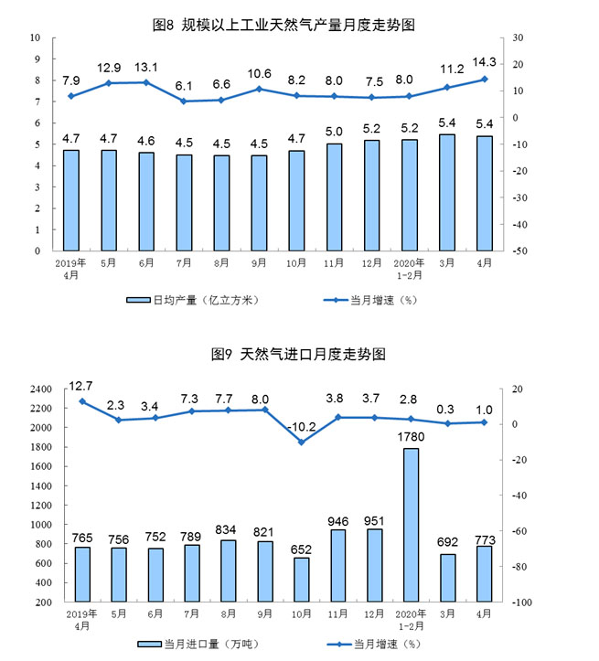 天然氣生產(chǎn)加快。4月份,生產(chǎn)天然氣161億立方米,同比增長(zhǎng)14.3%,增速比上月加快3.1個(gè)百分點(diǎn),日均產(chǎn)量5.4億立方米。1—4月份,生產(chǎn)天然氣644億立方米,同比增長(zhǎng)10.3%。