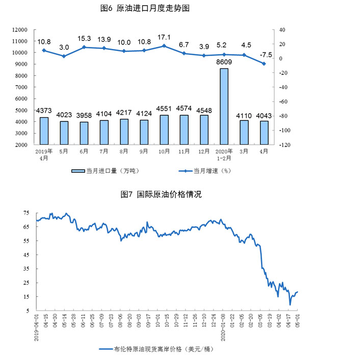 原油進(jìn)口下降,國(guó)際原油價(jià)格低位震蕩。4月份,進(jìn)口原油4043萬(wàn)噸,同比下降7.5%。1—4月份,進(jìn)口原油16761萬(wàn)噸,同比增長(zhǎng)1.7%。4月30日布倫特原油現(xiàn)貨離岸價(jià)格為18.11美元/桶,比3月31日的14.85美元/桶上漲22.0%。