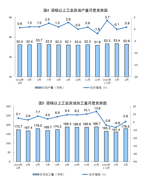 原油生產(chǎn)平穩(wěn),加工量由降轉(zhuǎn)增。4月份,生產(chǎn)原油1587萬(wàn)噸,同比增長(zhǎng)0.9%,增速由負(fù)轉(zhuǎn)正,上月為下降0.1%,日均產(chǎn)量52.9萬(wàn)噸;加工原油5385萬(wàn)噸,同比增長(zhǎng)0.8%,上月為下降6.6%,日均加工179.5萬(wàn)噸。1—4月份,生產(chǎn)原油6444萬(wàn)噸,同比增長(zhǎng)2.0%;加工原油20348萬(wàn)噸,同比下降3.4%。