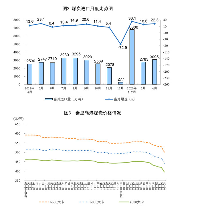 煤炭進(jìn)口增長(zhǎng)較快,交易價(jià)格有所下跌。4月份,進(jìn)口煤炭3095萬(wàn)噸,同比增長(zhǎng)22.3%;1—4月份,進(jìn)口煤炭1.3億噸,同比增長(zhǎng)26.9%。港口煤炭綜合交易價(jià)格繼續(xù)下跌,5月8日秦皇島港5500、5000和4500大卡煤炭?jī)r(jià)格分別為每噸501元、442元和396元,比4月3日分別下跌39元、41元和36元。