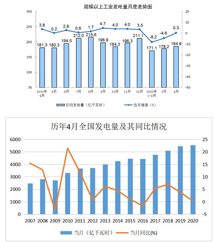 電力生產(chǎn)由降轉(zhuǎn)增。今年4月份,全國(guó)發(fā)電量達(dá)5543億千瓦時(shí),同比增長(zhǎng)0.3%,上月為下降4.6%,日均發(fā)電量184.8億千瓦時(shí),環(huán)比增加6.6億千瓦時(shí)。1-4月份,發(fā)電量21388億千瓦時(shí),同比下降5.0%。