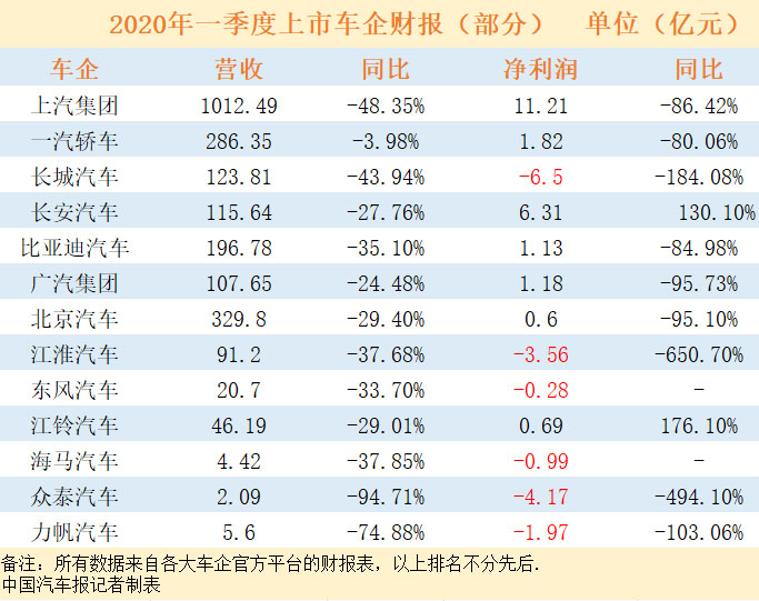 近日,隨著多家國內(nèi)上市車企2020年一季度財報的陸續(xù)發(fā)布,銷量下滑的影響也直觀地體現(xiàn)在了一季度財報上。車企們一季度營業(yè)收入和凈利潤雙下滑,虧損經(jīng)營也成為普遍現(xiàn)象。主要受疫情影響,上汽集團、一汽轎車、比亞迪、長城、北京汽車、廣汽集團在一季度遭遇“滑鐵盧”,面臨營收、凈利雙下跌,其中凈利潤下滑均超八成;大部分合資工廠都位于疫情核心地區(qū)湖北省的東風(fēng)汽車,呈現(xiàn)虧損也是意料之中;雖然長安汽車、江鈴汽車一季度凈利潤實現(xiàn)同比增長超100%,但扣除非經(jīng)常性損益后仍為虧損狀態(tài);而對于原本處在邊緣化的眾泰汽車、海馬和力帆股份來說,今年一季度財報更是不忍直視,行業(yè)“馬太效應(yīng)”加速。