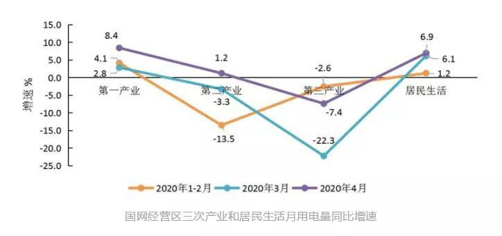 4月份,國家電網(wǎng)經(jīng)營區(qū)(下同)全社會用電量4354億千瓦時,同比增長0.7%,增速較3月份回升5.3個百分點。其中,三次產(chǎn)業(yè)和居民生活用電量同比增速分別為8.4%、1.2%、-7.4%和6.9%。第二產(chǎn)業(yè)用電量增速由負(fù)轉(zhuǎn)正,已恢復(fù)并超過去年同期水平;第三產(chǎn)業(yè)用電量降幅明顯收窄,表明社會經(jīng)濟(jì)活動正加快恢復(fù)。三次產(chǎn)業(yè)和居民生活用電增速環(huán)比分別回升5.6、4.5、14.8和0.8個百分點。