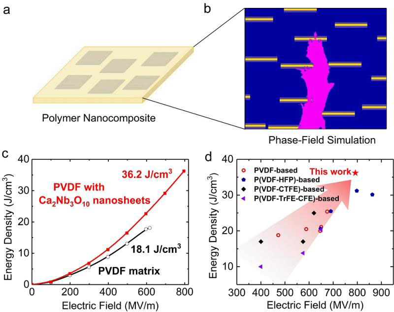圖例說明:a. 復(fù)合材料示意圖。b. 復(fù)合材料電擊穿過程的相場(chǎng)模擬中,帶負(fù)電Ca2Nb3O10納米片對(duì)電樹枝發(fā)展起阻礙作用。c. PVDF基復(fù)合材料與純PVDF的儲(chǔ)能密度與電場(chǎng)的關(guān)系。d. 不同聚合物基納米復(fù)合材料的擊穿強(qiáng)度和能量密度的對(duì)比。