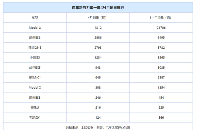 如果在中國獨資的特斯拉也稱得上“新勢力”的話,特斯拉Model 3則為造車新勢力單一車型銷量第一名,其銷量達4312輛;由于特斯拉近期頻繁調(diào)價造成用戶持幣觀望,其4月上險數(shù)據(jù)環(huán)比3月大幅下滑63.8%。即便如此,特斯拉的單一車型銷量表現(xiàn)仍一騎絕塵,可見,我國新創(chuàng)車企在打造爆款車型方面仍有很長的路要走。