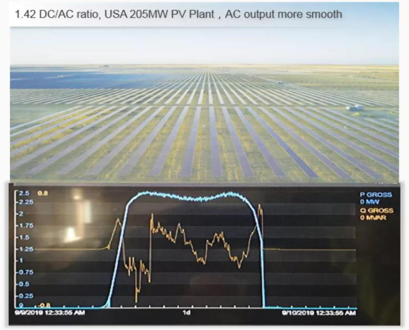 下圖是陽光電源在美國一個(gè)205MW實(shí)際電站的日輸出功率曲線,該電站采用1.42倍容配比+跟蹤系統(tǒng)設(shè)計(jì)。由圖可見,逆變器從早上8:00點(diǎn)到下午17:00一直處于滿功率運(yùn)行狀態(tài),相比于傳統(tǒng)光伏電站拋物線型的發(fā)電曲線,該電站的發(fā)電功率曲線更為平滑,整個(gè)光伏電站的輸出更加穩(wěn)定,大大提高了電網(wǎng)友好性。