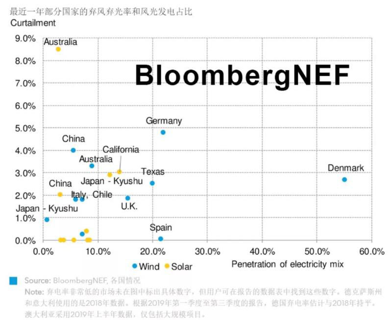 圖表:最近一年部分國家的棄風(fēng)棄光率和風(fēng)光發(fā)電占比(來源:彭博新能源財(cái)經(jīng))