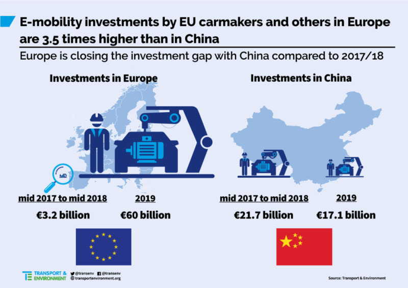 當(dāng)?shù)貢r(shí)間5月25日,總部位于布魯塞爾的歐洲非盈利組織——運(yùn)輸與環(huán)境(T&E)發(fā)布報(bào)告稱,2019年歐洲在電動(dòng)汽車領(lǐng)域的總投資額已經(jīng)超過(guò)中國(guó),達(dá)到了創(chuàng)紀(jì)錄的600億歐元(約合人民幣4671億元),較此前高出近20倍。