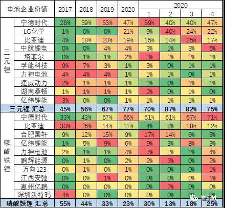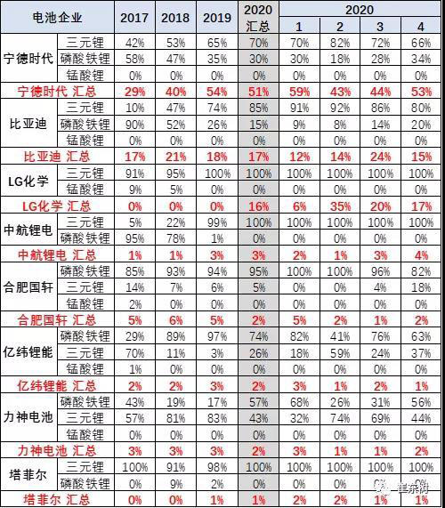 寧德時(shí)代的三元里的產(chǎn)量占比在快速提升中。尤其是寧德時(shí)代為代表2020年的三元鋰占比自身總量達(dá)到70%,2020年4月達(dá)到自身66%比例。