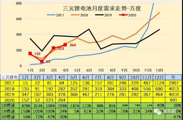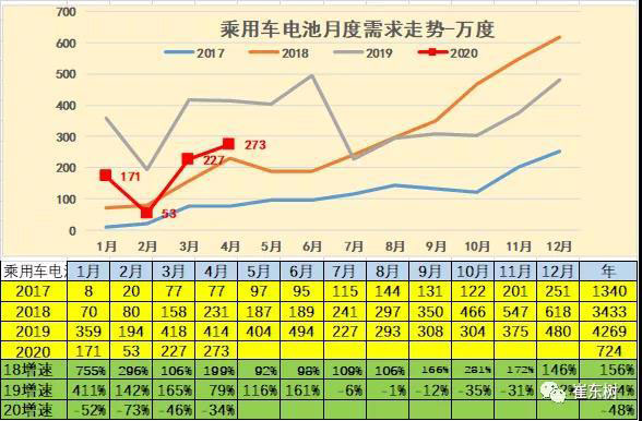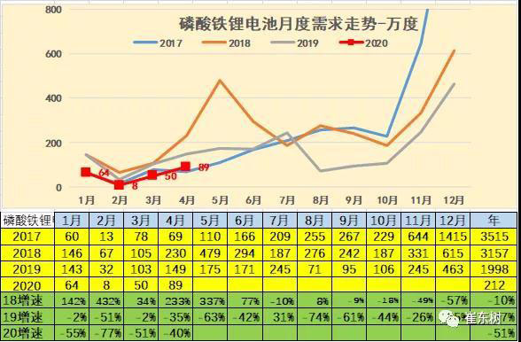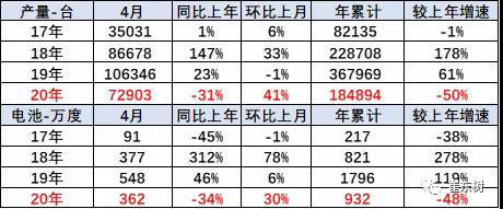2020年4月的電池需求362萬(wàn)度,大幅低于2019年4月的電池548萬(wàn)度需求,也稍低于2018年的4月產(chǎn)銷(xiāo)。考慮貼退坡前后的干擾因素,因此2020年4月的電池需求還稍差。