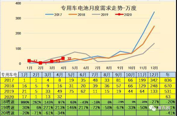 2020年初專(zhuān)用車(chē)用電需求增長(zhǎng)較猛,隨后下滑較大。4月的專(zhuān)用車(chē)電池需求32萬(wàn)度,較去年同期的49萬(wàn)度大幅下降近34%。