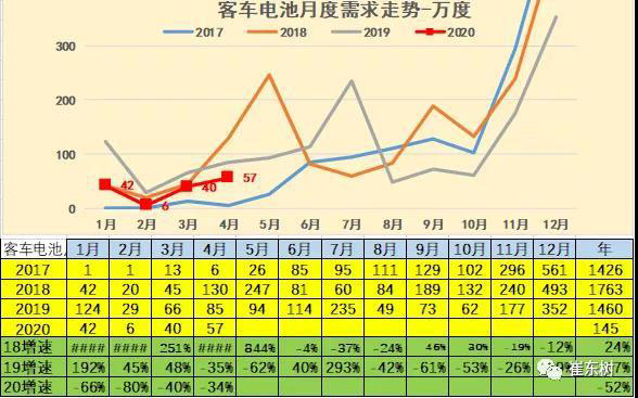 4月客車(chē)的電池需求較低,達(dá)到57萬(wàn)度電,同比下降34%。