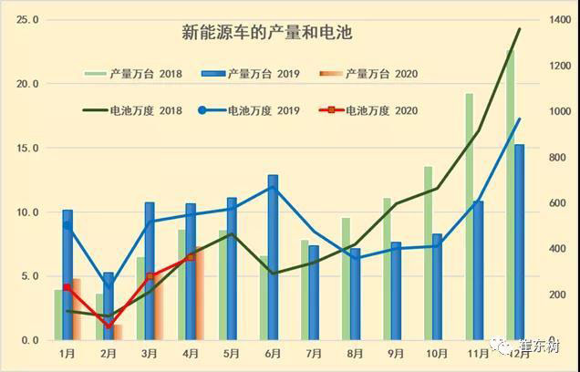 根據(jù)崔東樹(shù)個(gè)人測(cè)算,按照汽車(chē)生產(chǎn)合格證數(shù)據(jù):2020年4月新能源汽車(chē)產(chǎn)量7.29萬(wàn)臺(tái),同比下降31%;電池裝機(jī)總電量約362萬(wàn)度,同比下降34%,