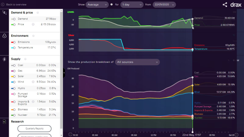英國(guó)公用事業(yè)公司Drax旗下電力監(jiān)測(cè)系統(tǒng)Electric Insights數(shù)據(jù)顯示,在上個(gè)周末(5月23日至24日)前,英國(guó)電力部門的負(fù)電價(jià)和二氧化碳排放雙雙創(chuàng)下歷史新低。