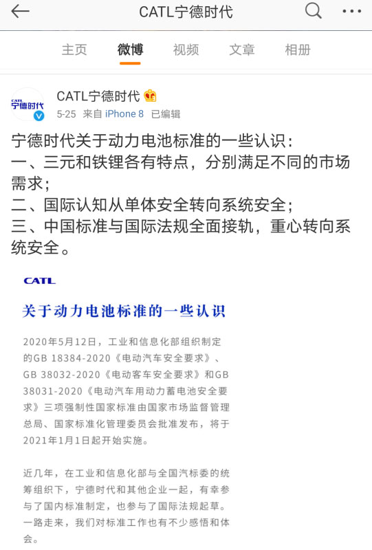 隨后,寧德時(shí)代在官方微博發(fā)布了《關(guān)于動(dòng)力電池標(biāo)準(zhǔn)的一些認(rèn)識(shí)》,內(nèi)容包括三元和鐵鋰電池分別滿足不同市場的需求;目前國際認(rèn)知從電池單體安全轉(zhuǎn)向電池系統(tǒng)安全;中國標(biāo)準(zhǔn)的重心在轉(zhuǎn)向電池系統(tǒng)安全等三點(diǎn)內(nèi)容。